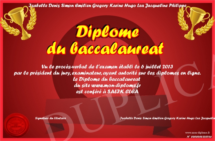 Envoyez par email votre Diplôme du baccalaureat personalisé