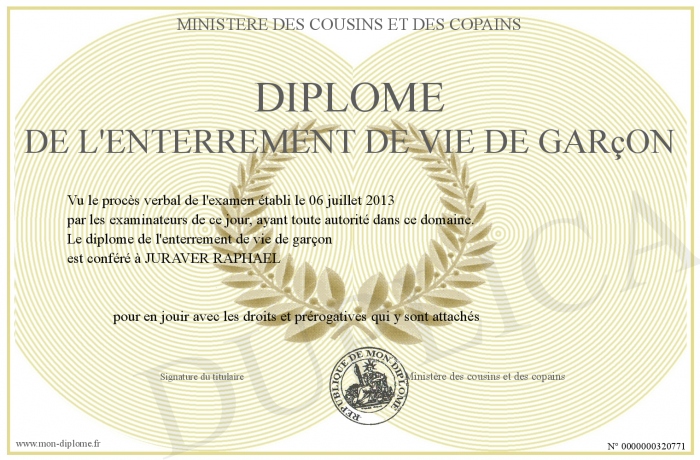Envoyez par email votre Diplôme de l'enterrement de vie de garçon personalisé