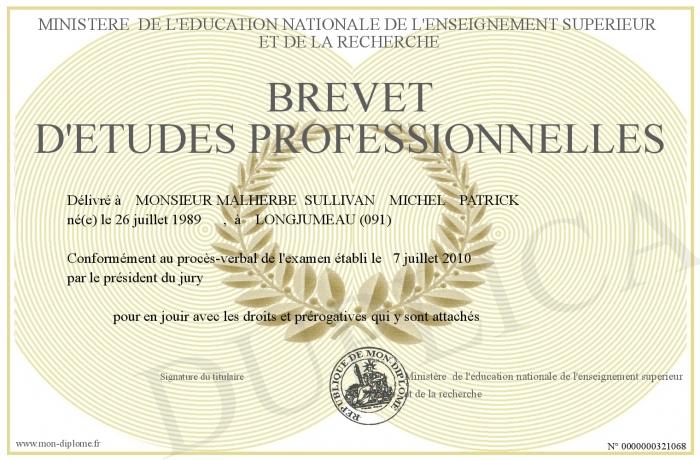 Envoyez par email votre brevet d'études professionnelles personalisé