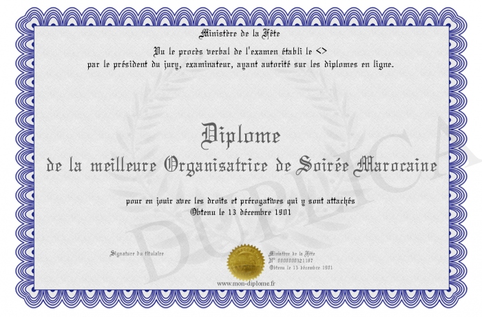 Envoyez par email votre Diplôme de la meilleure Organisatrice de Soirée Marocaine personalisé