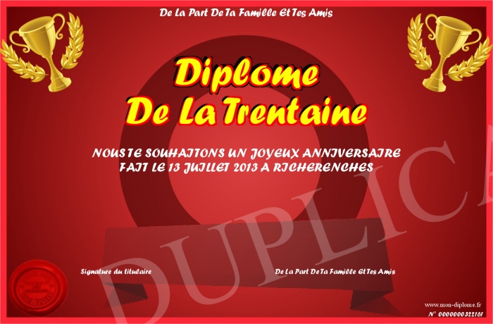 Envoyez par email votre Diplôme De La Trentaine personalisé