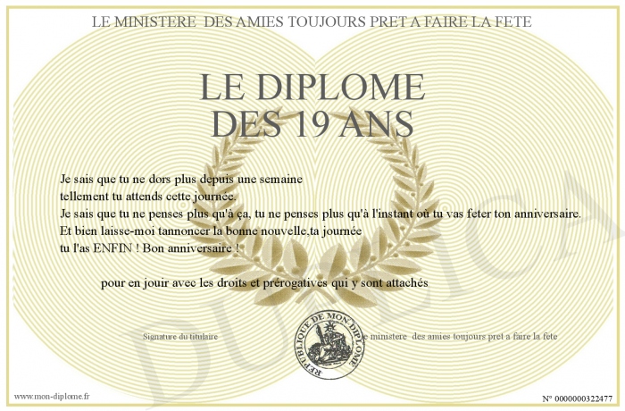 Envoyez par email votre le diplome des 19 ans personalisé