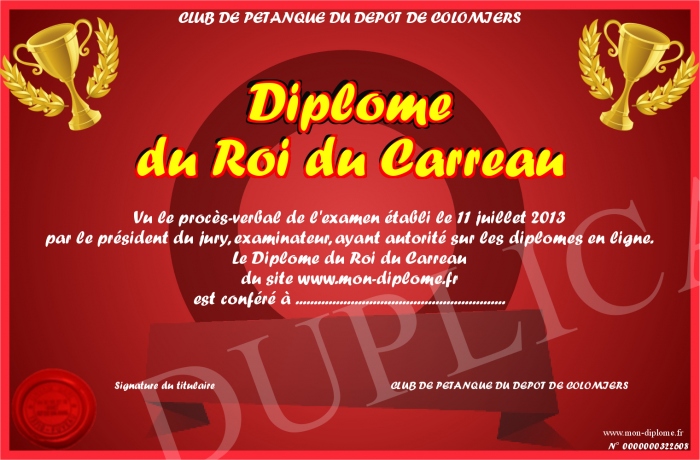 Envoyez par email votre Diplôme du Roi du Carreau personalisé