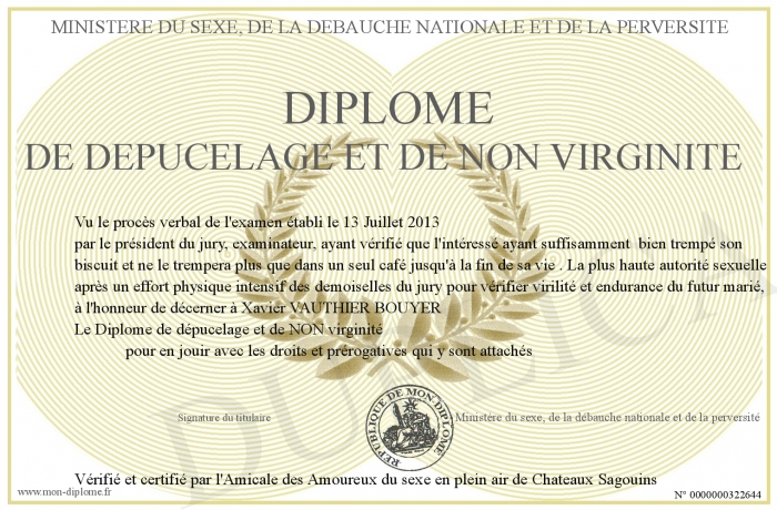 Envoyez par email votre Diplôme de dépucelage et de NON virginité personalisé