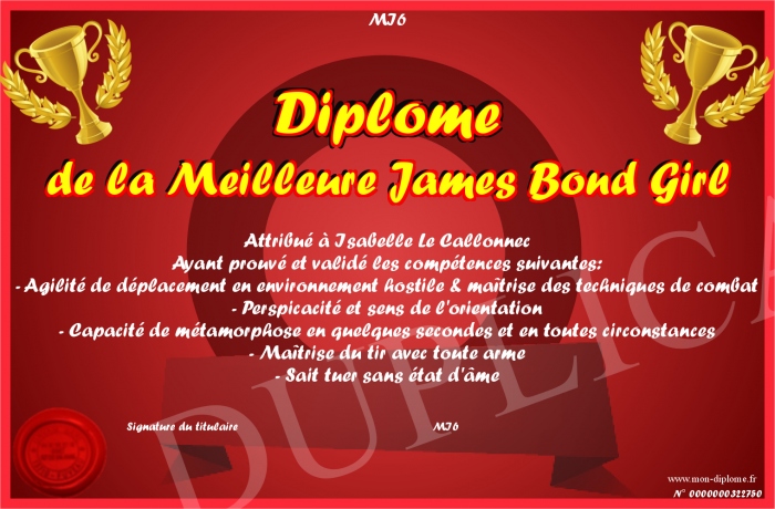Envoyez par email votre Diplôme de la Meilleure James Bond Girl personalisé