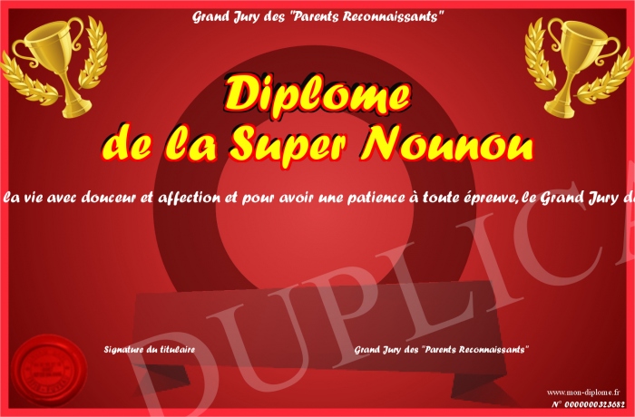 Envoyez par email votre Diplôme de la Super Nounou personalisé
