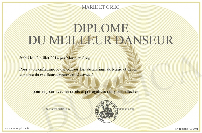 Envoyez par email votre Diplome du meilleur danseur personalisé
