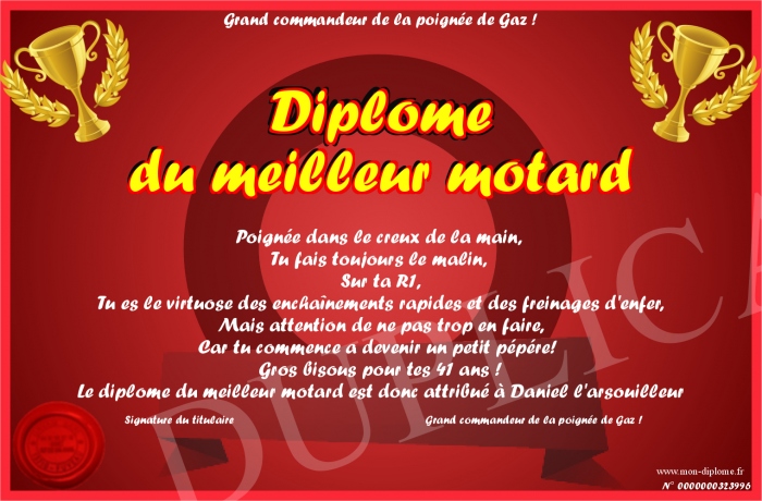 Envoyez par email votre Diplôme du meilleur motard personalisé
