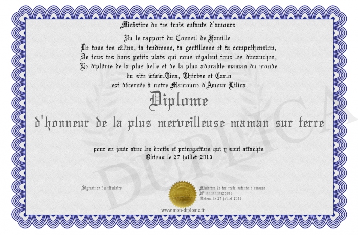 Envoyez par email votre Diplôme d'honneur de la plus merveilleuse maman sur terre personalisé