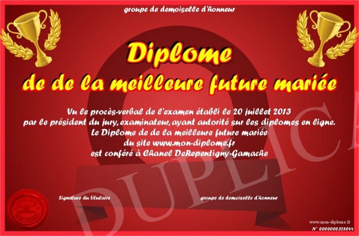 Envoyez par email votre Diplôme de de la meilleure future mariée personalisé