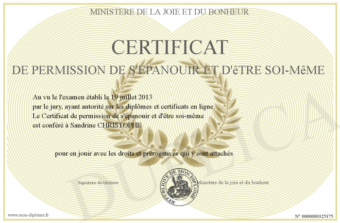 Envoyez par email votre Certificat de permission de s'épanouir et d'être soi-même personalisé
