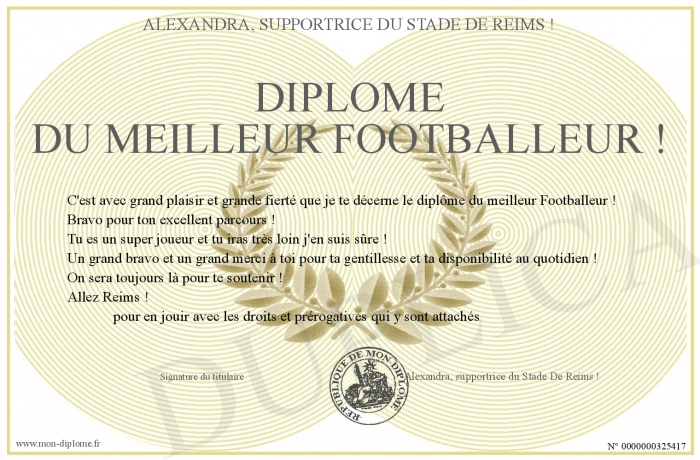 Envoyez par email votre Diplôme du meilleur footballeur ! personalisé