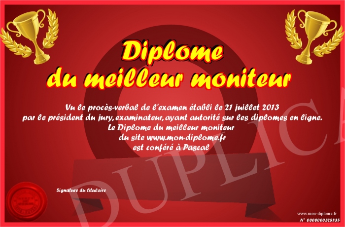 Envoyez par email votre Diplôme du meilleur moniteur personalisé