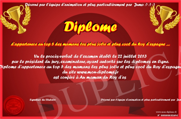Envoyez par email votre Diplôme d'appartenece au top 5 des mamans les plus jolie et plus cool du Roy d'espagne .... personalisé