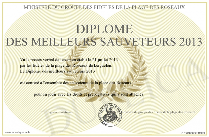 Envoyez par email votre Diplôme des meilleurs sauveteurs 2013 personalisé