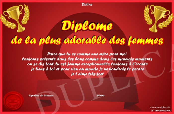 Envoyez par email votre Diplôme de la plus adorable des femmes personalisé