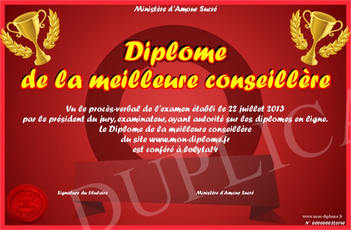 Envoyez par email votre Diplôme de la meilleure conseillère personalisé