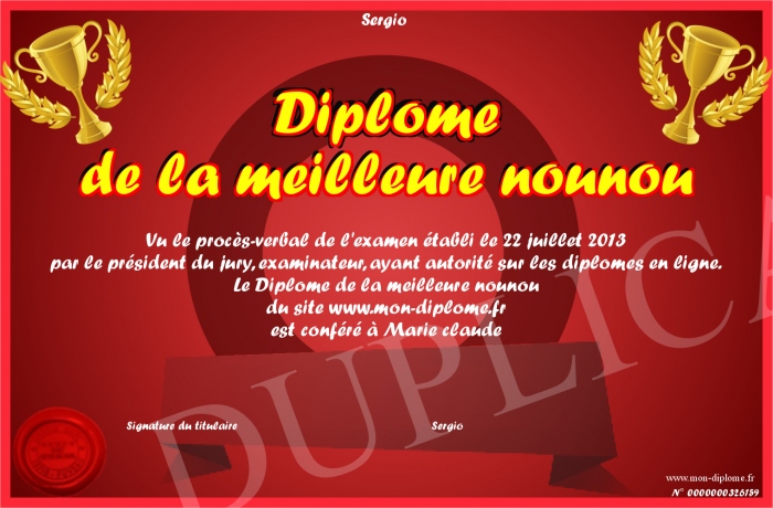Envoyez par email votre Diplôme de la meilleure nounou personalisé