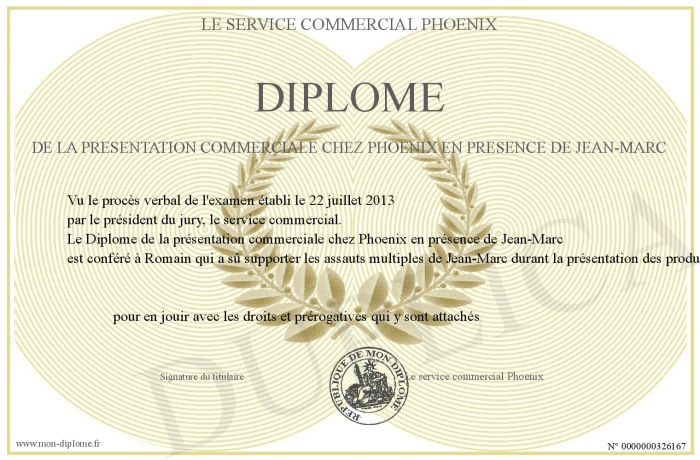 Envoyez par email votre Diplôme de la présentation commerciale chez Phoenix en présence de Jean-Marc personalisé