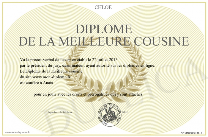 Envoyez par email votre Diplôme de la meilleure cousine personalisé