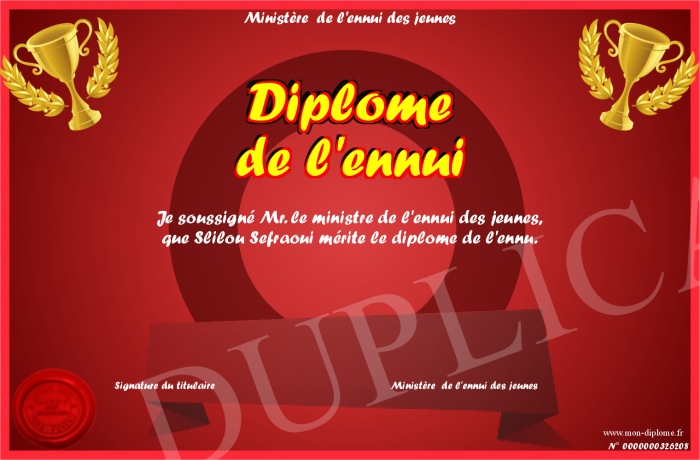 Envoyez par email votre Diplôme de l'ennui personalisé