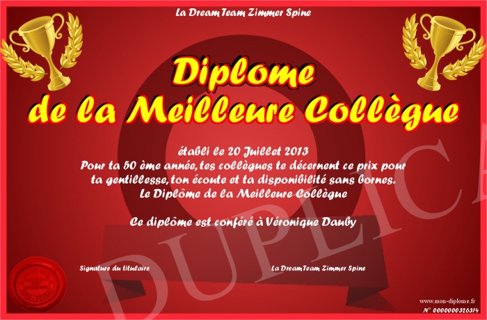 Envoyez par email votre Diplôme de la Meilleure Collègue personalisé