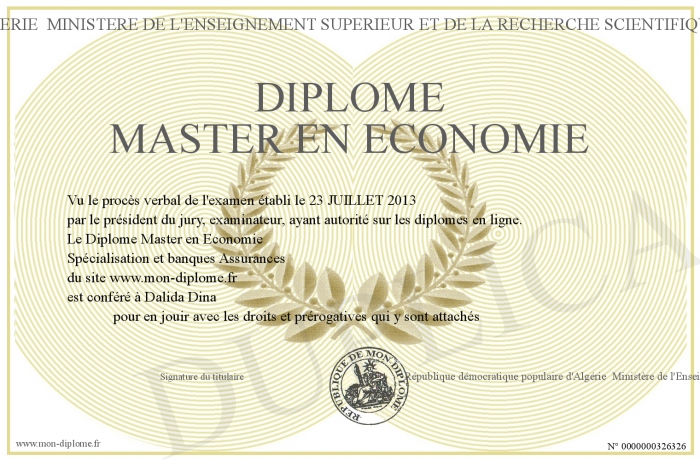 Envoyez par email votre Diplôme MASTER EN ECONOMIE personalisé