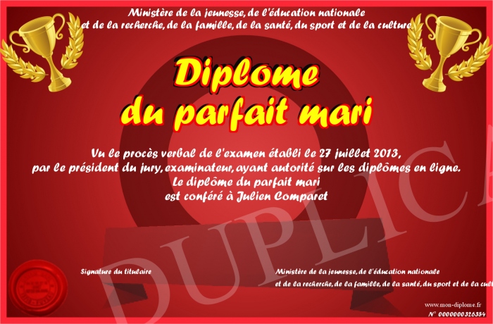 Envoyez par email votre Diplôme du parfait mari personalisé