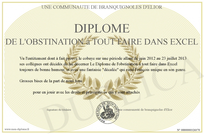 Envoyez par email votre Diplome de l'obstination à tout faire dans Excel personalisé