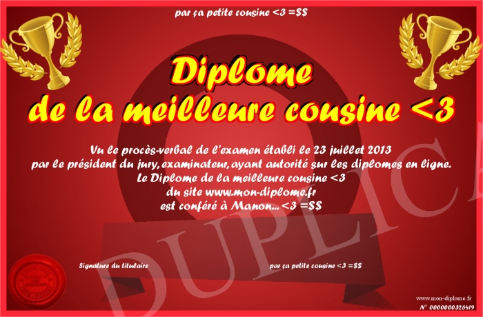 Envoyez par email votre Diplome de la meilleure cousine -3 personalisé