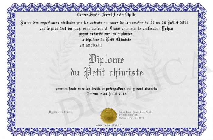 Envoyez par email votre Diplôme du Petit chimiste personalisé