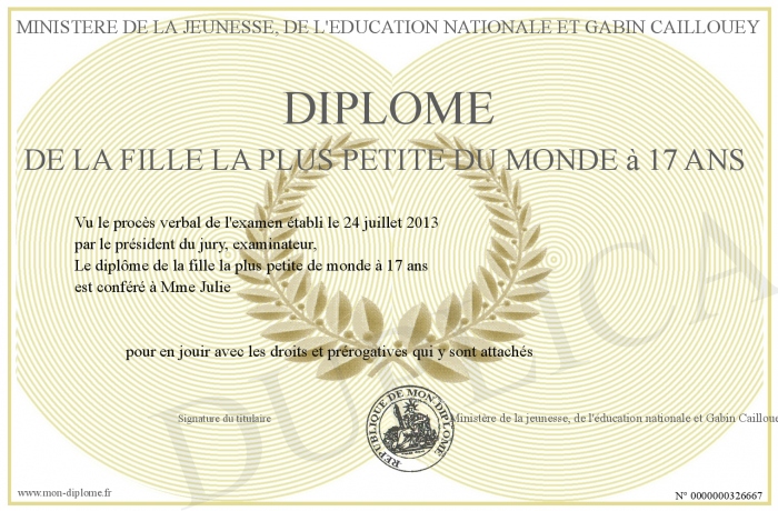 Envoyez par email votre Diplôme de la fille la plus petite du monde à 17 ans personalisé