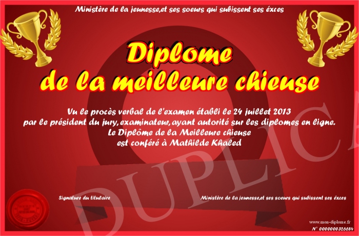 Envoyez par email votre Diplôme de la meilleure chieuse personalisé