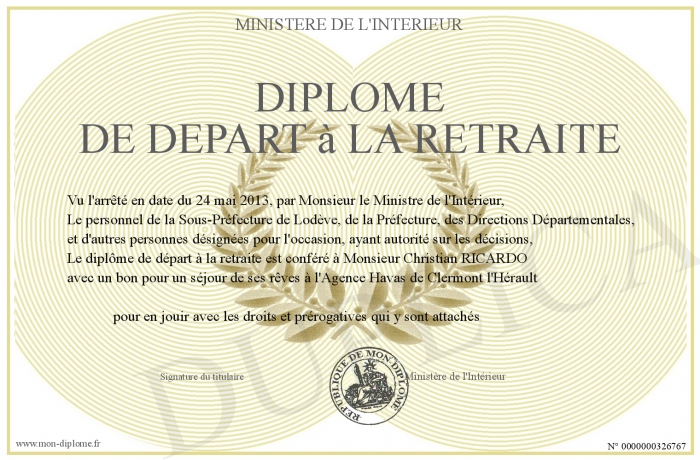 Envoyez par email votre Diplôme de départ à la retraite personalisé