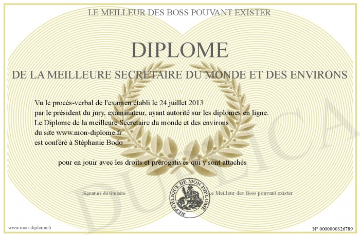 Envoyez par email votre Diplôme de la meilleure Secretaire du monde et des environs personalisé