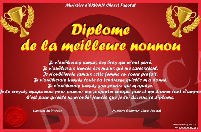 Envoyez par email votre Diplôme de la meilleure nounou personalisé