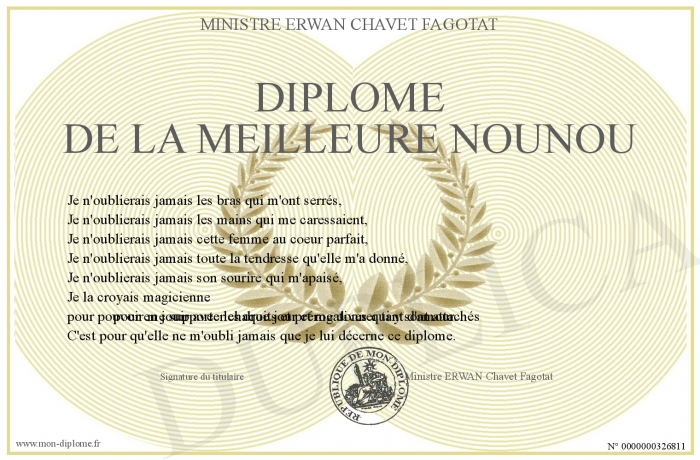 Envoyez par email votre Diplôme de la meilleure nounou personalisé