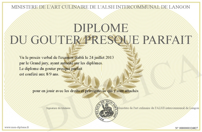 Envoyez par email votre diplôme du gouter presque parfait personalisé