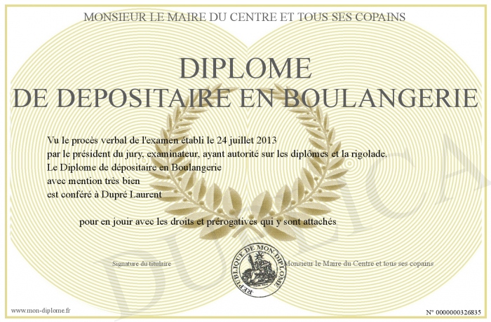 Envoyez par email votre Diplome de dépositaire en Boulangerie personalisé