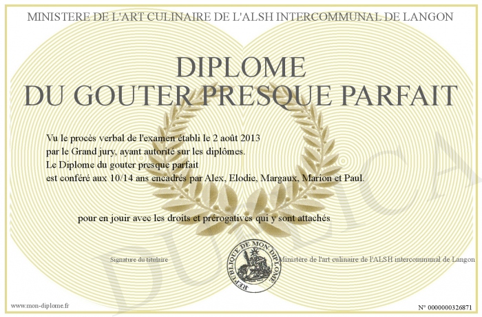 Envoyez par email votre Diplôme du gouter presque parfait personalisé