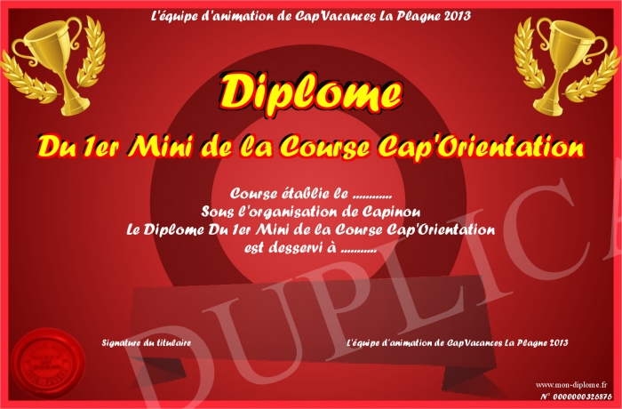 Envoyez par email votre Diplome Du 1er Mini de la Course Cap'Orientation personalisé