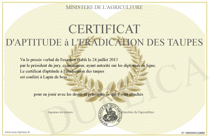 Envoyez par email votre certificat d'aptitude à l'éradication des taupes personalisé