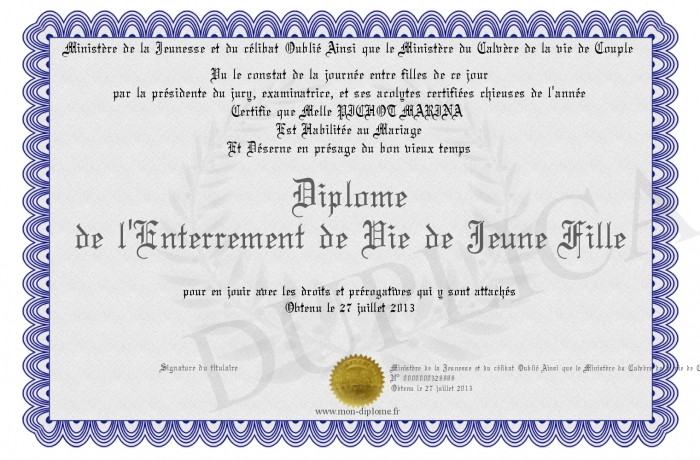 Envoyez par email votre Diplôme de l'Enterrement de Vie de Jeune Fille personalisé
