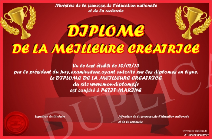Envoyez par email votre DIPLOME DE LA MEILLEURE CREATRICE personalisé