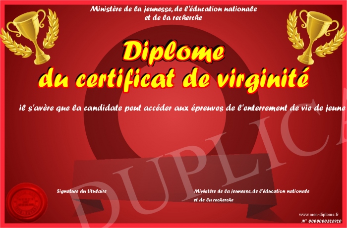 Envoyez par email votre Diplôme du certificat de virginité personalisé