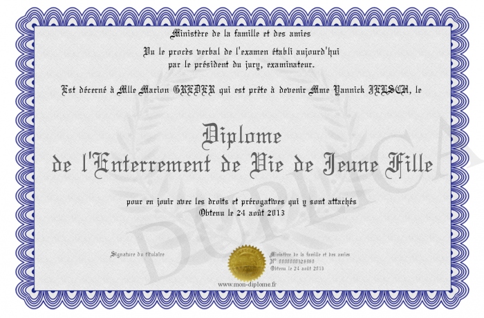 Envoyez par email votre Diplôme de l'Enterrement de Vie de Jeune Fille personalisé