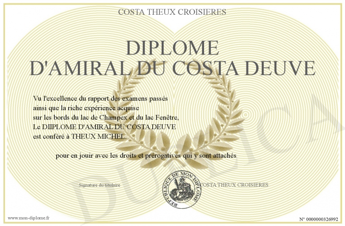 Envoyez par email votre DIPLOME D'AMIRAL DU COSTA DEUVE personalisé