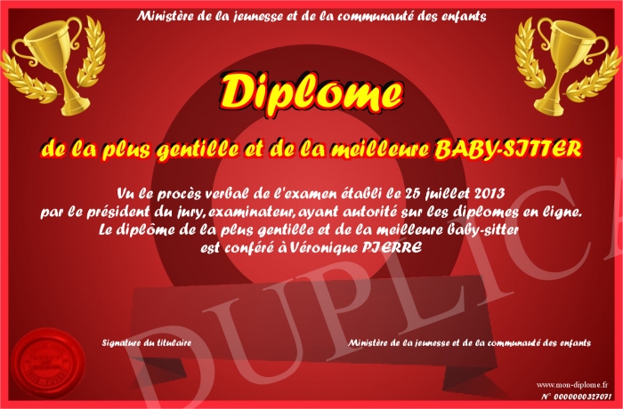 Envoyez par email votre Diplôme de la plus gentille et de la meilleure BABY-SITTER personalisé