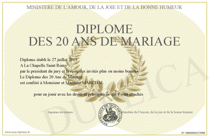 Envoyez par email votre Diplôme des 20 Ans de Mariage personalisé