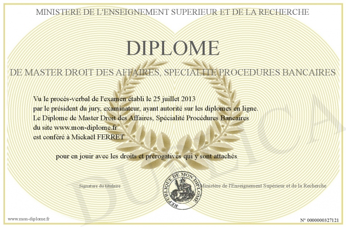 Envoyez par email votre Diplôme de Master Droit des Affaires, Spécialité Procédures Bancaires personalisé